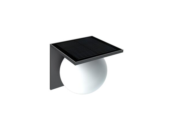 Lampioncino a LED fotovoltaico da parete, composto da: fonte luminosa a LED ad alta efficienza da 6W, pannello FV integrato da 1,5Wp, batteria al Litio integrata da 7,4Wh e scheda elettronica di controllo per la corretta gestione delle ore di accensione, della quantità di luce generata e della carica della batteria.